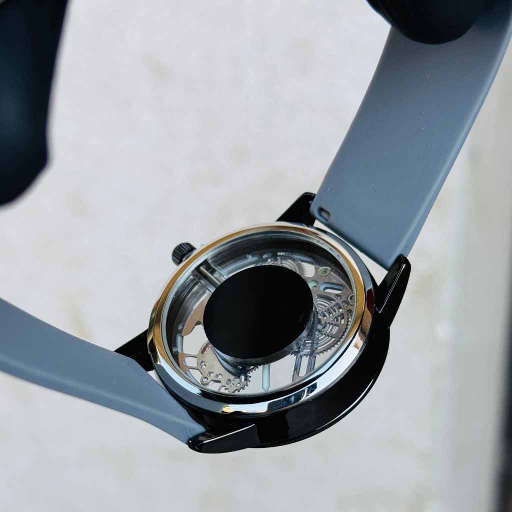 Elevate your style with our sleek Gray And Black Gents Watch featuring a comfortable and durable rubber strap and an innovative magnetic closure.