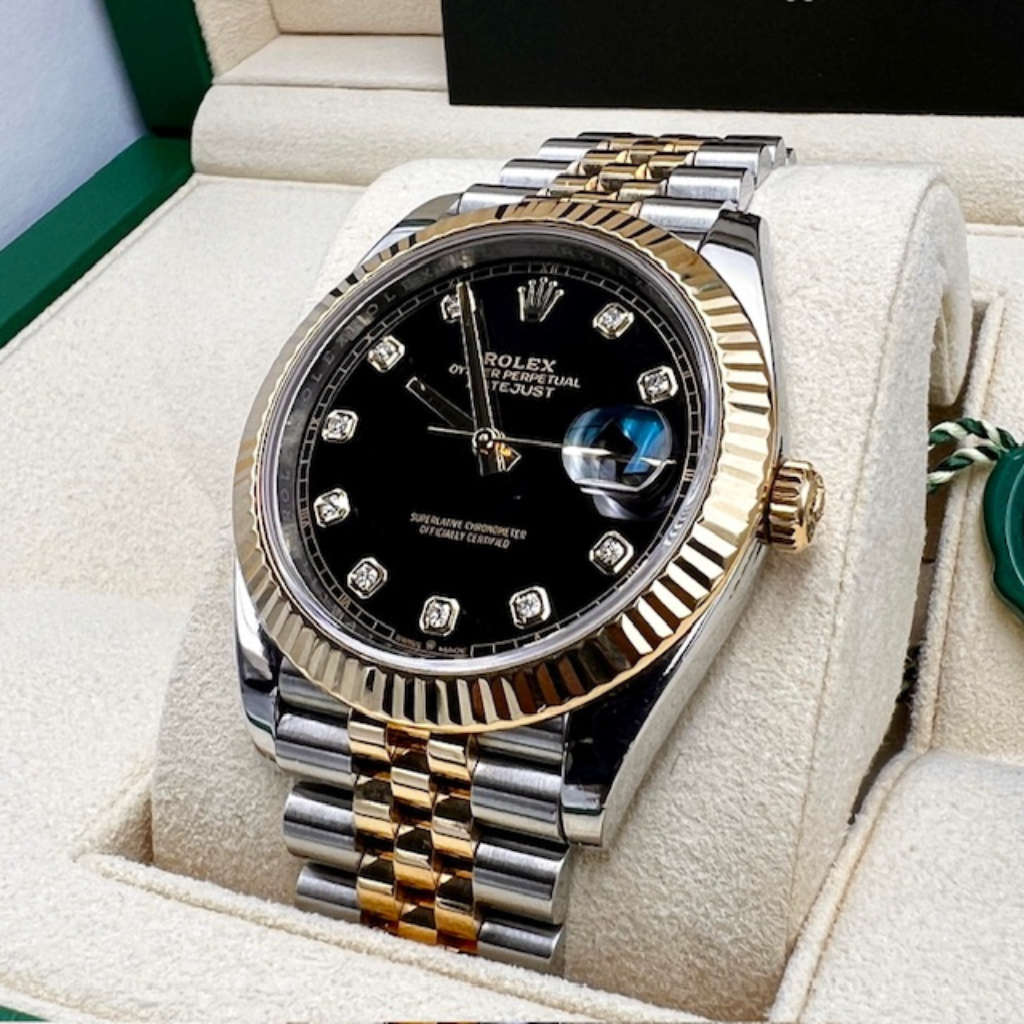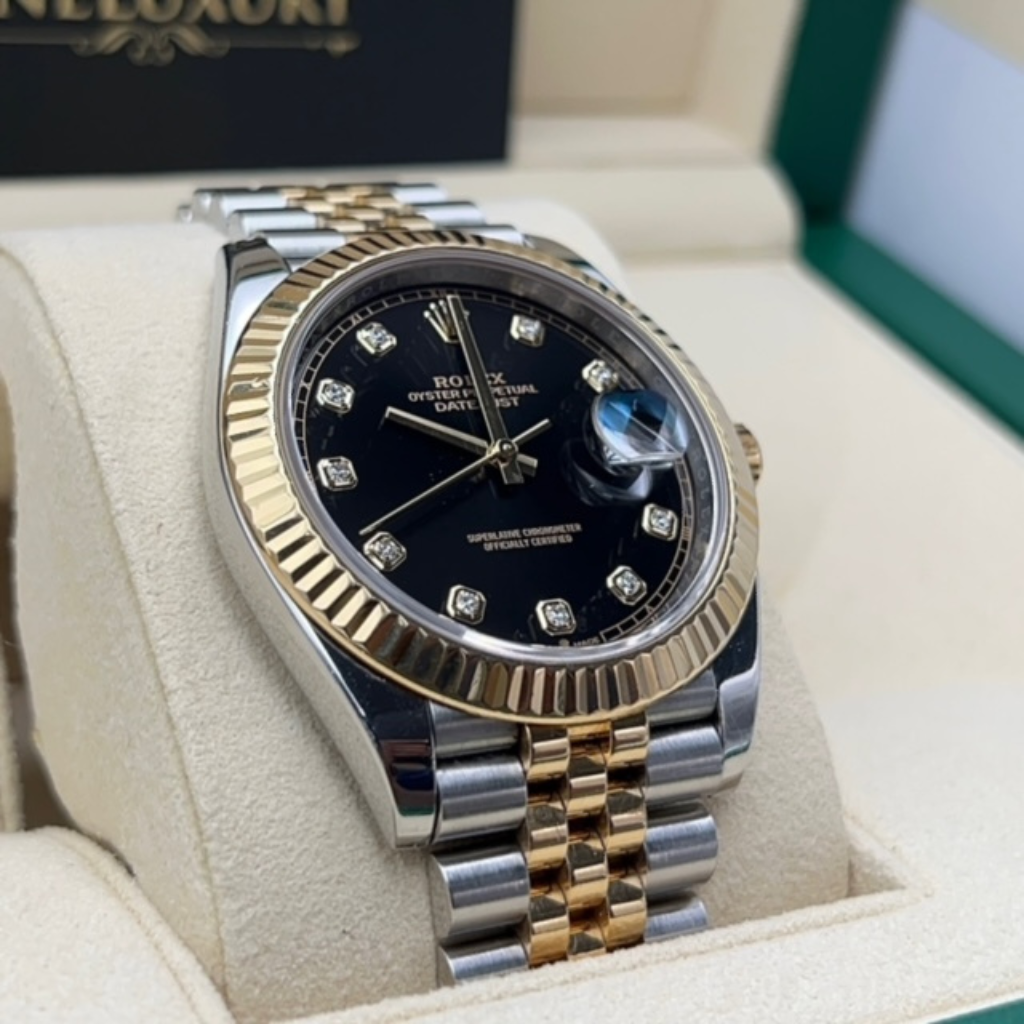 Rlx Datejust 41mm with black diamond dial. Yellow Rolesor case with 904L steel monobloc middle case, screw-down steel back, 18K yellow gold screw-down crown, 18K yellow gold fluted bezel, scratch-resistant double anti-reflective sapphire crystal with cyclops lens over the date, index hour markers, Rlx calibre 3235 perpetual self-winding movement with date at 3 o’clock that changes instantaneously at midnight in a few thousandths of a second, approximately 70 hours of power reserve, yellow Rolesor Jubilee bracelet made from a combination of 904L steel and 18K yellow gold with five-piece links, folding Oysterclasp buckle with Easylink 5mm comfort extension link. Waterproof to 100 meters.