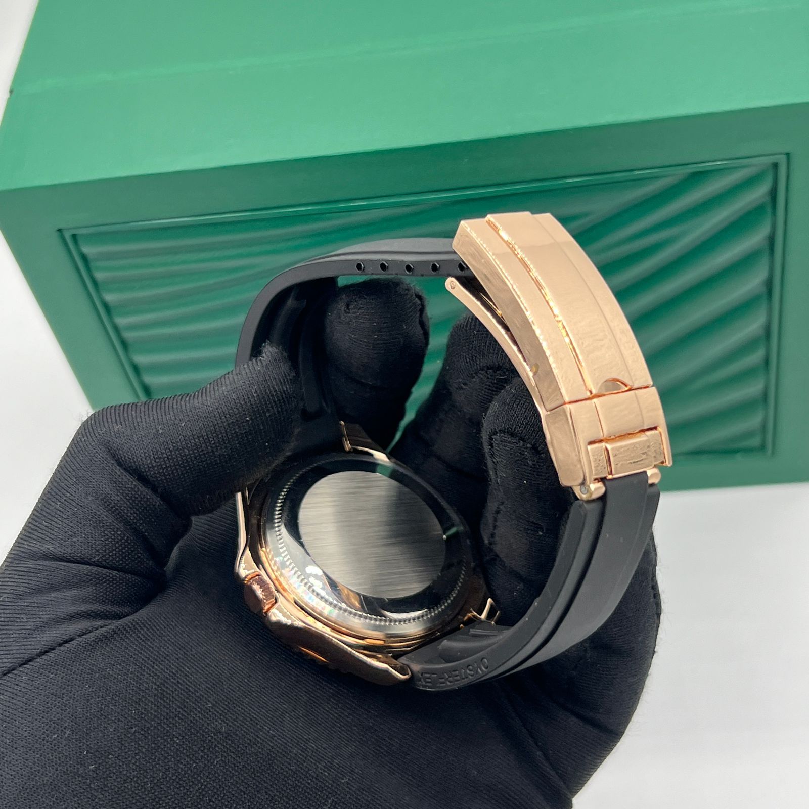 The Yacht-Master’s new Oysterflex bracelet, developed by Premium Quality and patented, offers a sporty alternative to metal bracelets. The bracelet attaches to the watch case and the Oysterlock safety clasp by a flexible titanium and nickel alloy metal blade. The blade is overmoulded with high-performance black elastomer which is particularly resistant to environmental effects, very durable and perfectly inert for the wearer of the watch. For enhanced comfort, the inside of the Oysterflex bracelet is equipped with a patented longitudinal cushion system that stabilizes the watch on the wrist and fitted with an 18 ct yellow gold Oysterlock safety clasp. It also features the Premium Quality Glidelock extension system, designed by the brand and patented. This inventive toothed mechanism, integrated beneath the clasp, allows fine adjustment of the bracelet length by some 15 mm in increments of approximately 2.5 mm, without the use of tools.